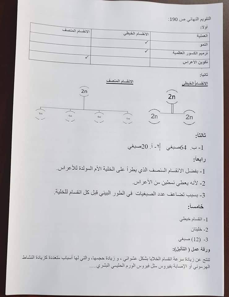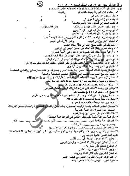 اوراق عمل علوم للصف التاسع سوريا 2020